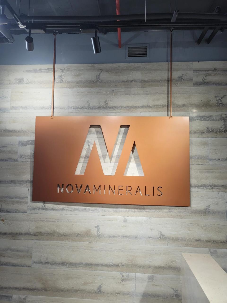 Diseño, fabricación e instalación de letrero corporativo para NOVAMINERALIS, empresa del sector minero-tecnológico. La propuesta se centró en generar una pieza industrial, elegante y moderna, alineada con la estética de su espacio interior.