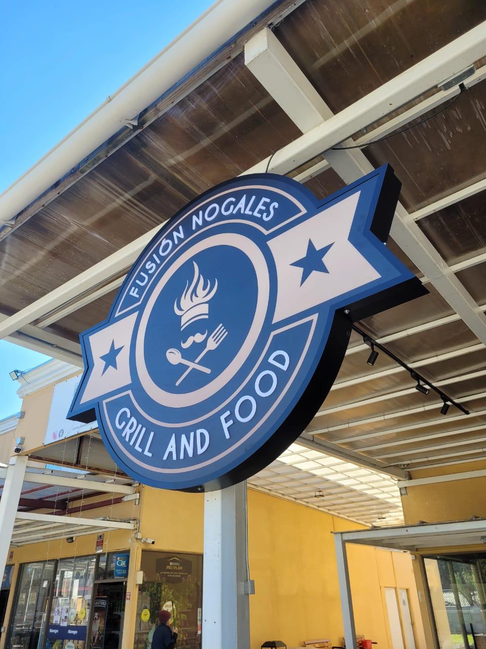 Diseño, fabricación e instalación de letrero publicitario exterior para Fusión Nogales Grill and Food, restaurante de cocina a la parrilla con identidad americana moderna. La pieza fue desarrollada para captar atención en vía pública, integrándose armónicamente con la arquitectura del local.