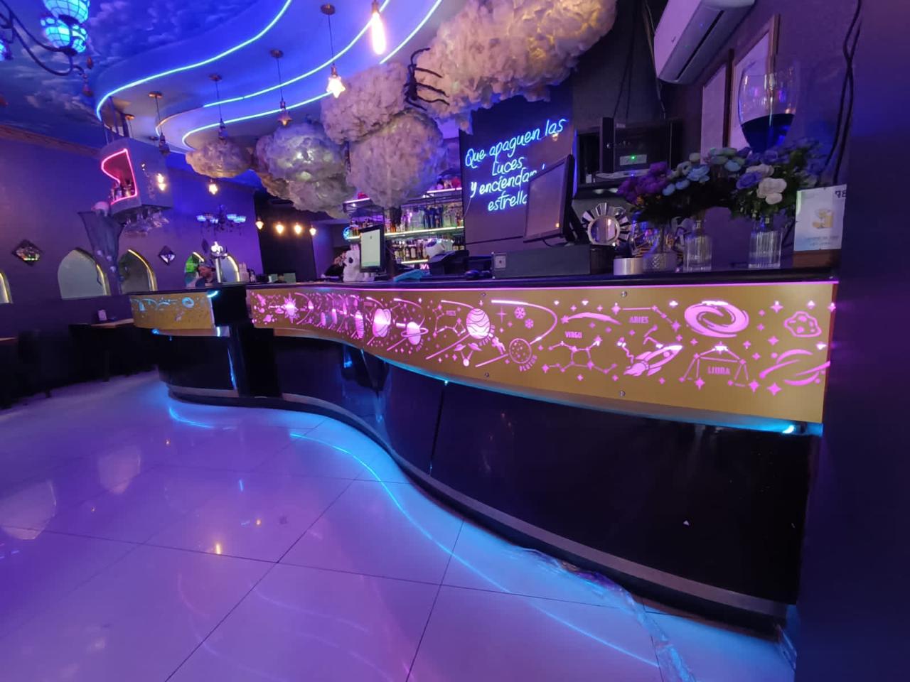 Este proyecto consistió en el diseño y decoración de una barra para un bar con temática espacial y de constelaciones. El trabajo incluyó la instalación de paneles con gráficos de planetas, constelaciones y signos zodiacales, combinando iluminación LED en tonos púrpura y azul para crear un ambiente futurista y envolvente.